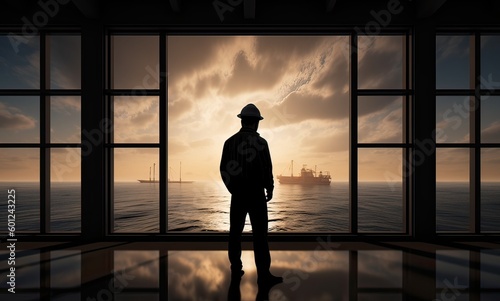 Construction concept. at back of the construction worker head which is wearing the safety helmet and checking work at the construction site. Non-existent person. Generative Ai