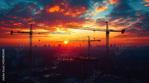 Construction cranes stretch against a fiery sunset sky, their silhouettes standing over a sprawling urban landscape, with darkening shadows below