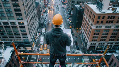 Construction Engineer on Scaffolding Reviewing Blueprints, City Street Below