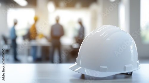 Construction helmet on table while workers discuss project details in office