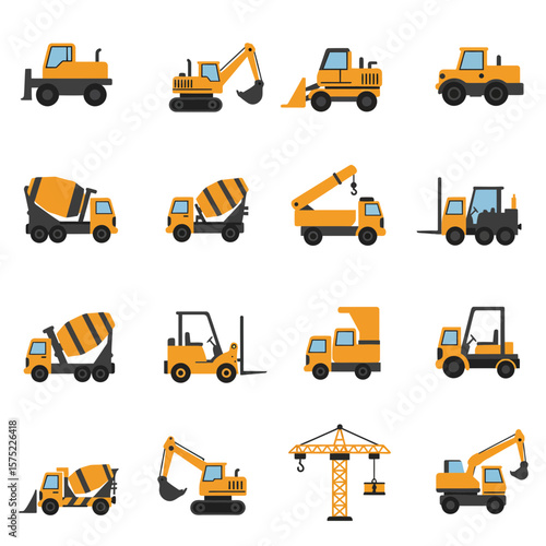 Construction Icon Set Flat Solid Design of Heavy Equipment and Machinery for Construction Sites - Icons for Website, App, and Presentation