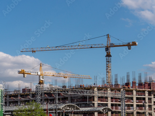 Construction of a multi-storey concrete building. Construction site with cranes and builders. Monolithic concrete. Concrete cast on site