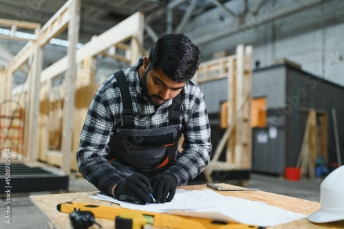 Construction of modern modular houses. Indian architect works with building plans