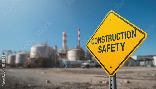 Construction safety sign warning industrial site with clear blue sky, caution message