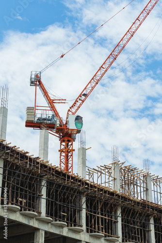 Construction site background. Hoisting cranes and new multi-storey buildings. Industrial background. Building construction site work against blue sky.