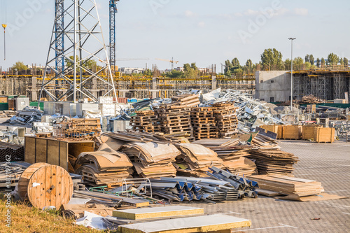 Construction site of shopping mall with cranes, wooden pallets and construction materials Kyiv. Obolon