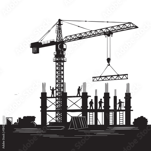 Construction Site Silhouette: An illustration of a bustling construction site, depicting workers and a towering crane collaborating to erect a building.