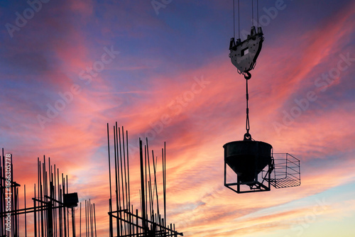 Construction site silhouettes against a twilight sky, featuring cranes, cement mixers, and steel trusses