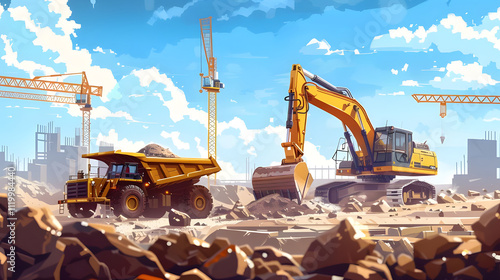 Construction site with excavator, dump truck, and cranes under a sunny sky.