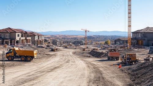 Construction site with ongoing development, showcasing machinery and new homes.