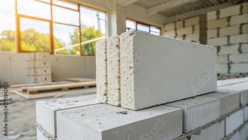 Construction site with stacked autoclaved aerated concrete blocks in sunlit room.