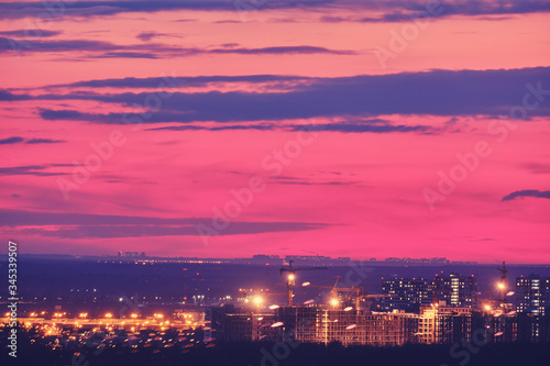 Construction stopped due to the coronavirus epidemic at sunset. Red sunset in the evening and construction of buildings in the city