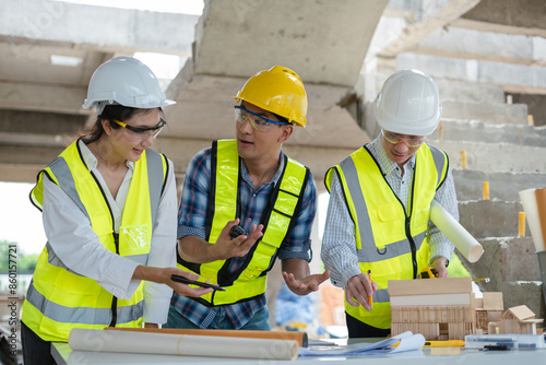 Construction team, blueprint and site building job for architect, builder and engineer sketching a construction project.