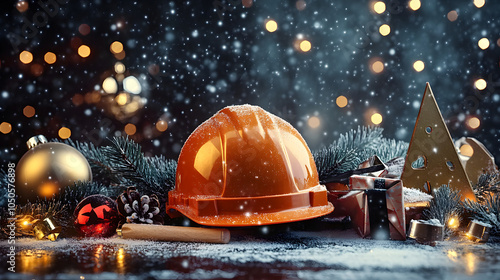 Construction tools, hard hat and Christmas decorations. Christmas and New Year construction. Extra wide banner background