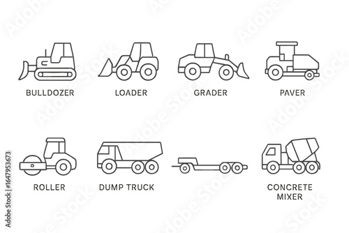 Construction vehicles illustrated including bulldozer, loader, grader, paver, roller, dump truck, and concrete mixer in a simple design