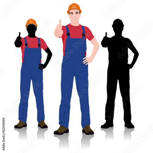Construction Worker and Silhouette Variations Giving a Thumbs Up Gesture. Vector Flat Style Illustration Isolated On White