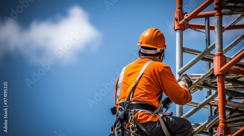 Construction worker ascending a ladder at a job site for building or maintenance work