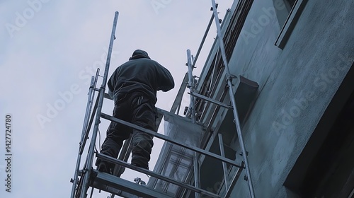Construction Worker Climbing Scaffold