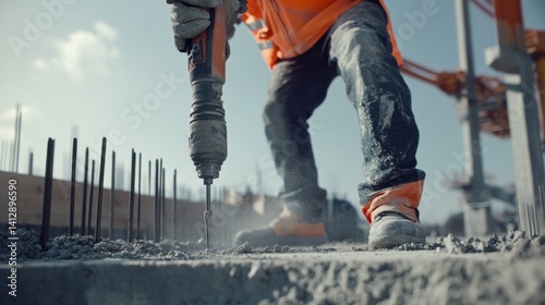 Construction worker drilling into concrete for anchor installation. Featuring strength and precision