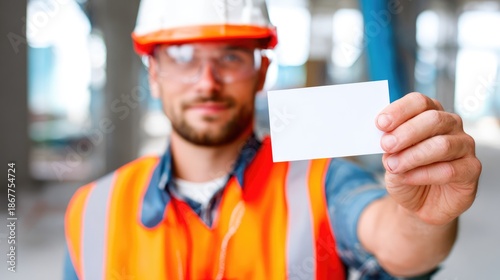 Construction Worker Holding Blank Business Card at Building Site