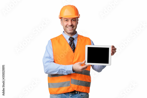 Construction Worker Holding Tablet With Blank Screen, Studio Shot, Mockup