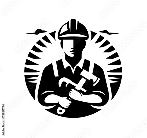 Construction worker holding tools, wearing a hard hat, in a stylized circular design with radiating lines.