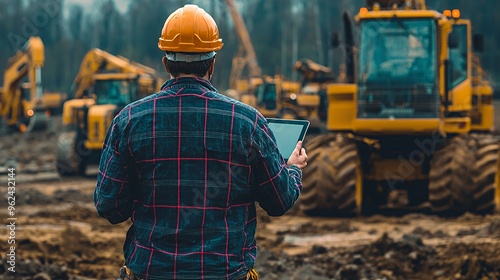 Construction worker in a hardhat looking at a tablet in front of a yellow excavator.