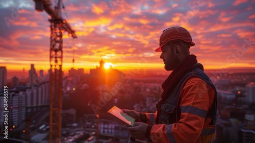 Construction worker in high-visibility jacket holding plans at sunset with a city skyline in the background and a crane beside him.