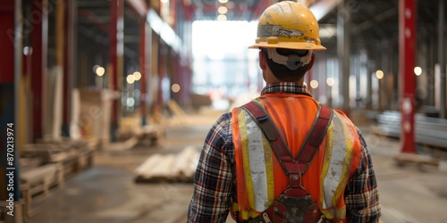 Construction Worker in Safety Gear Inside Large Industrial Warehouse