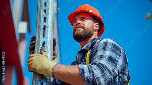 Construction Worker Installs Metal Beam Securely on Building Site Under Blue Sky