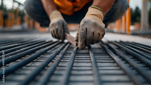 Construction worker measuring steel rods for reinforcement in concrete. Featuring expertise and accuracy