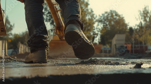 Construction worker pouring concrete for a foundation. Strength and precision