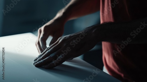 Construction worker sealing joints between drywall sheets. Featuring focus and technique