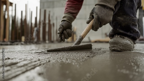 Construction worker smoothing freshly poured concrete. Urban construction site