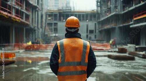Construction Worker Surveying Urban Development Project Site A Rainy Day Oversight of Modern Building