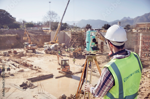 Construction worker surveyor using theodolite at sunny construction site