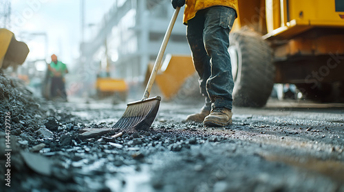 Construction Worker Sweeping Asphalt at Roadworks Site