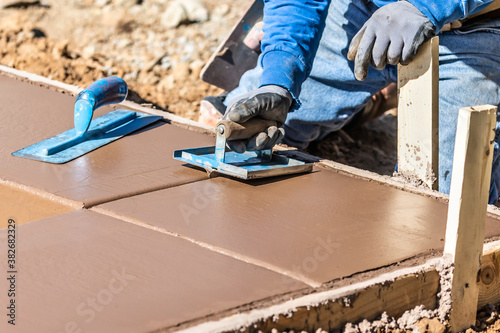 Construction Worker Using Hand Groover On Wet Cement Forming Coping Around New Pool
