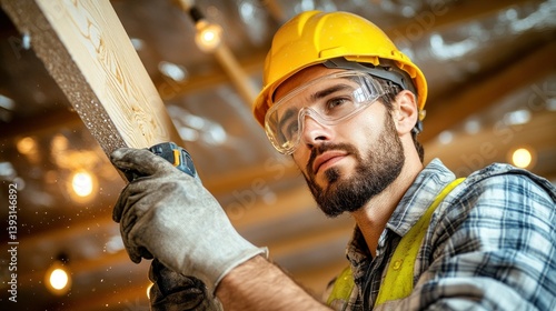 Construction worker using power tool on wooden beam. Focused craftsman in safety gear, meticulously working on a project