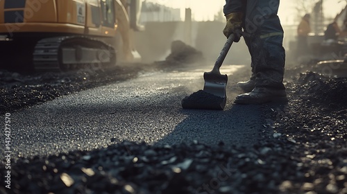 Construction Worker Using Shovel on Fresh Asphalt