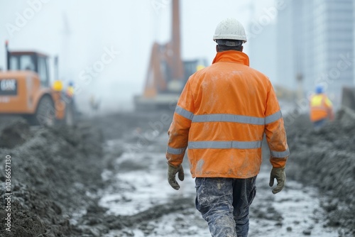 Construction workers are bustling at a site, heavy machinery maneuvering under the radiant sun, with an unfinished building rising behind them.