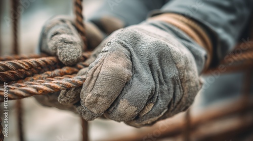 Construction Worker's Gloved Hands Gripping Rebar, Close Up View
