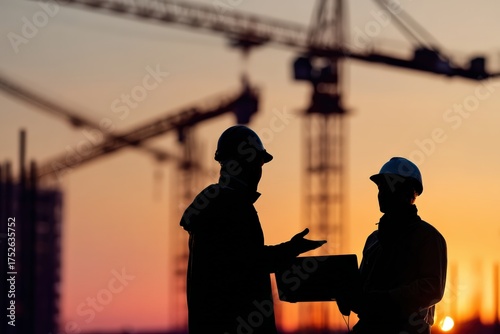 Construction workers wearing hard hats discussing blueprints on a building site, with cranes and scaffolding silhouetted at sunset