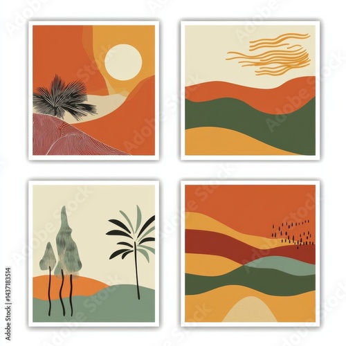 constructivist abstract landscape posters with geometric shapes and terracotta tones