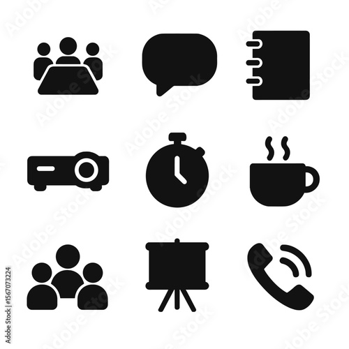 Consulting Icons Collection. Solid, filled icon set of consulting meetings: conference table, speech bubble, notebook, projector,