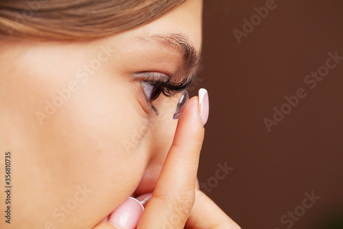 Contact lenses for vision. Young woman applies contact lenses