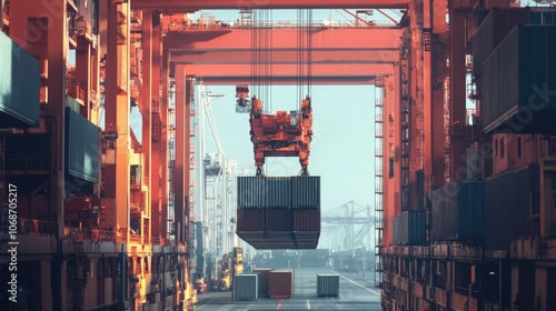 Container being lifted at shipping port front view Cargo handling efficiency