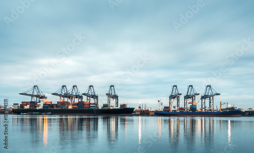 Container Cargo freight ship with working crane bridge in shipyard at dusk for Logistic Import Export background