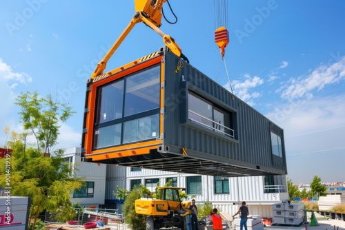 container house module is raised by a crane and placed