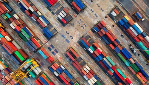 container ship in import export and business logistic.By crane ,Trade Port , Shipping.cargo to harbor.Aerial view.Top view.
